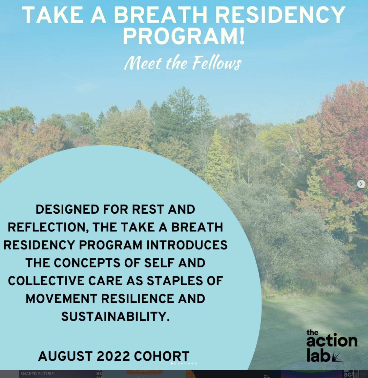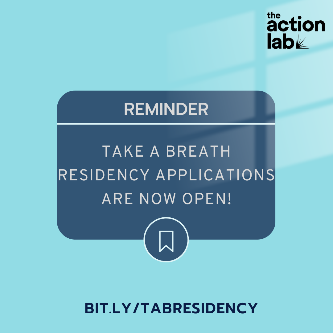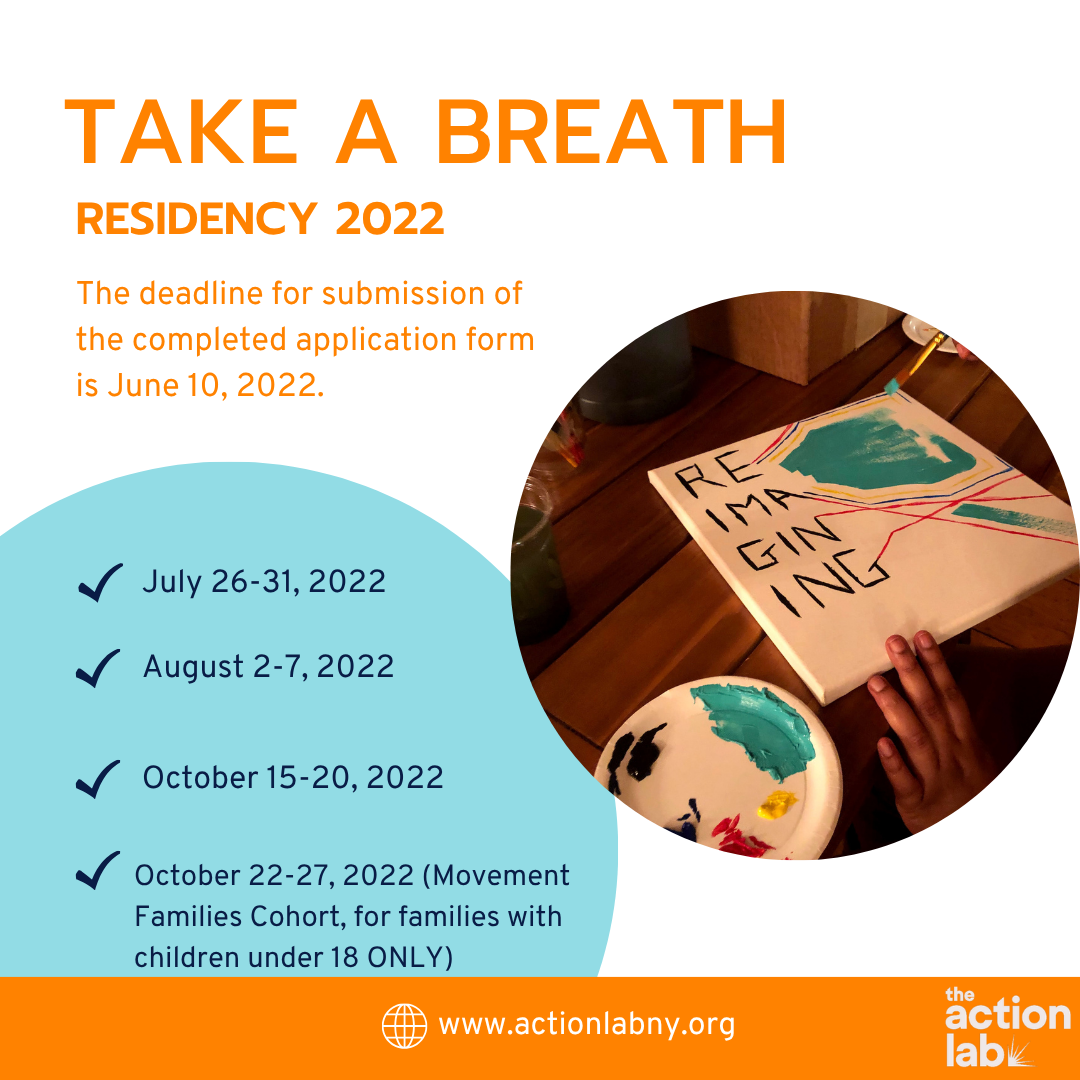 Take A Breath is a week-long residency for organizers, artists, and cultural workers to pause, reflect, and recharge — hosted at The Action Lab's 16-acre retreat center in Ossining, NY.